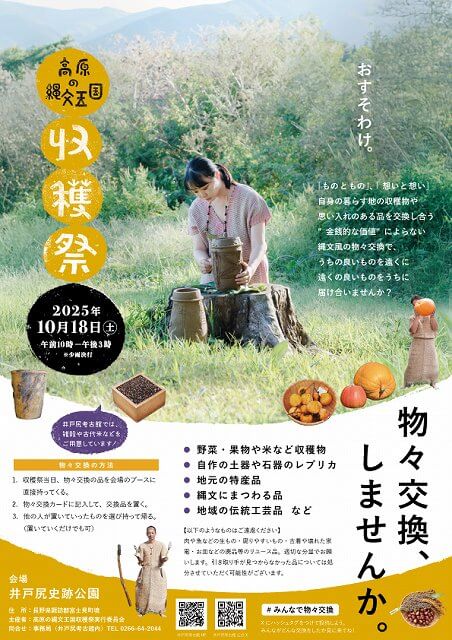 「高原の縄文王国収穫祭」ではワークショップや創作土器などの縄文や、地域にまつわる様々なお店が当日限りで並び、「物々交換」も行われます。