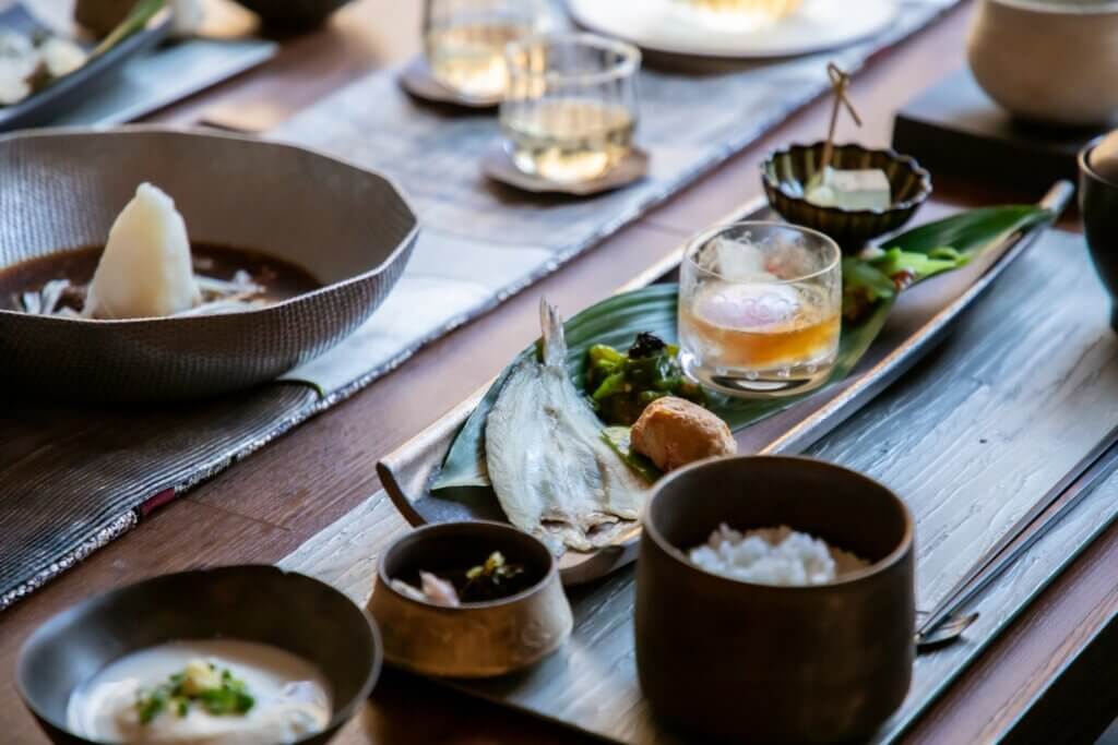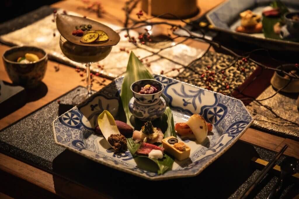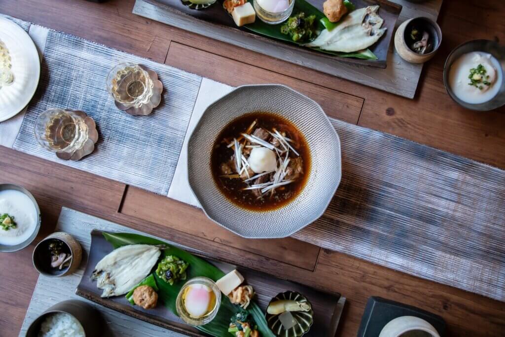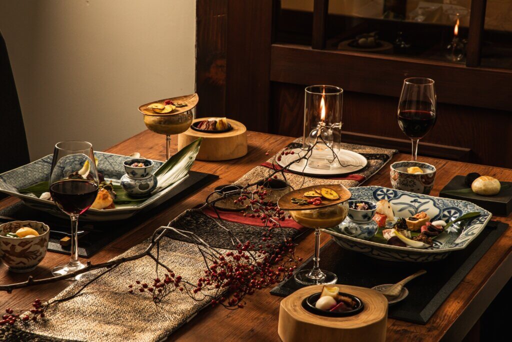 古伊万里などのアンティーク食器を基調に、現代の有田焼や漆器、作家ものを組み合わせたしつらえ。幾重の時代が融合する岩崎葉子の世界観を映したテーブルでご提供いたします。また岩崎葉子が自らデザインした世界に一つだけの信楽焼の器なども使用。蓼科 親湯温泉のお食事に合わせてコーディネートされた上質な器の数々。記念日や特別な旅はもちろん、器の世界に触れたい方にもおすすめです。写真映えもする美しい食事シーンを記憶に残すためにぜひカメラをお持ちください。