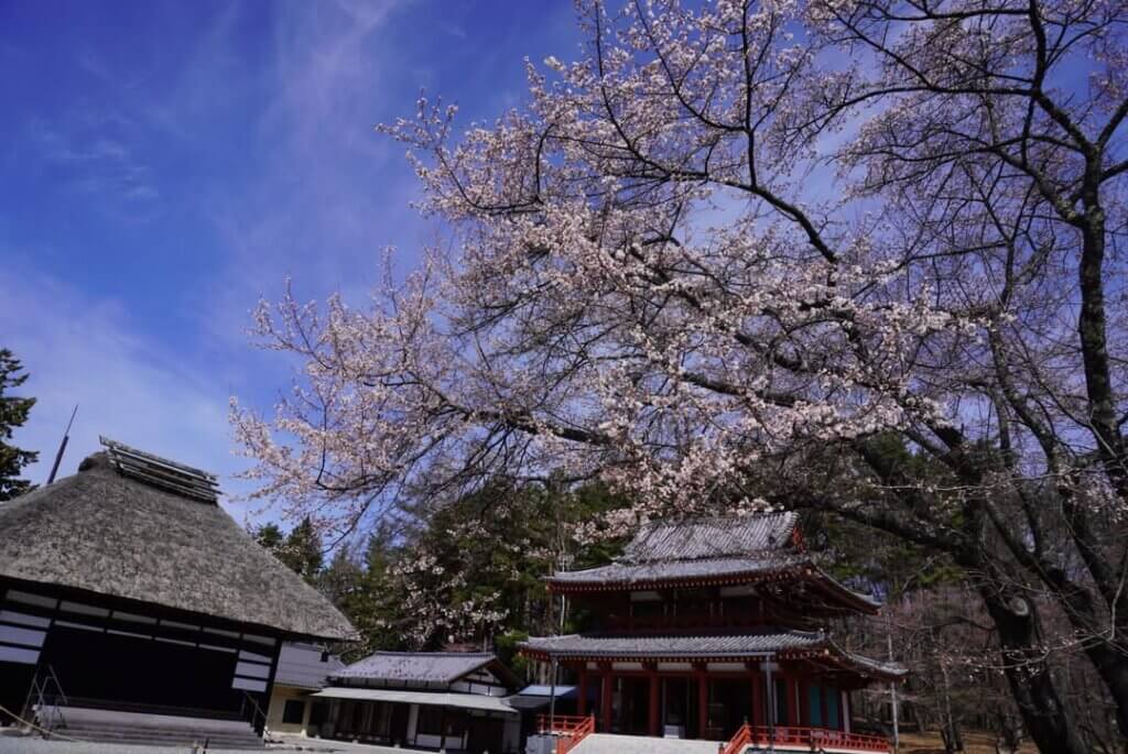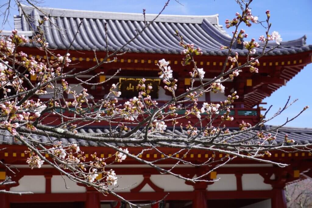 約300本に及ぶ桜と本堂の朱色が鮮やかです。