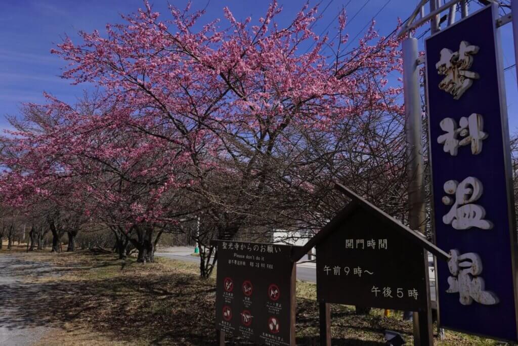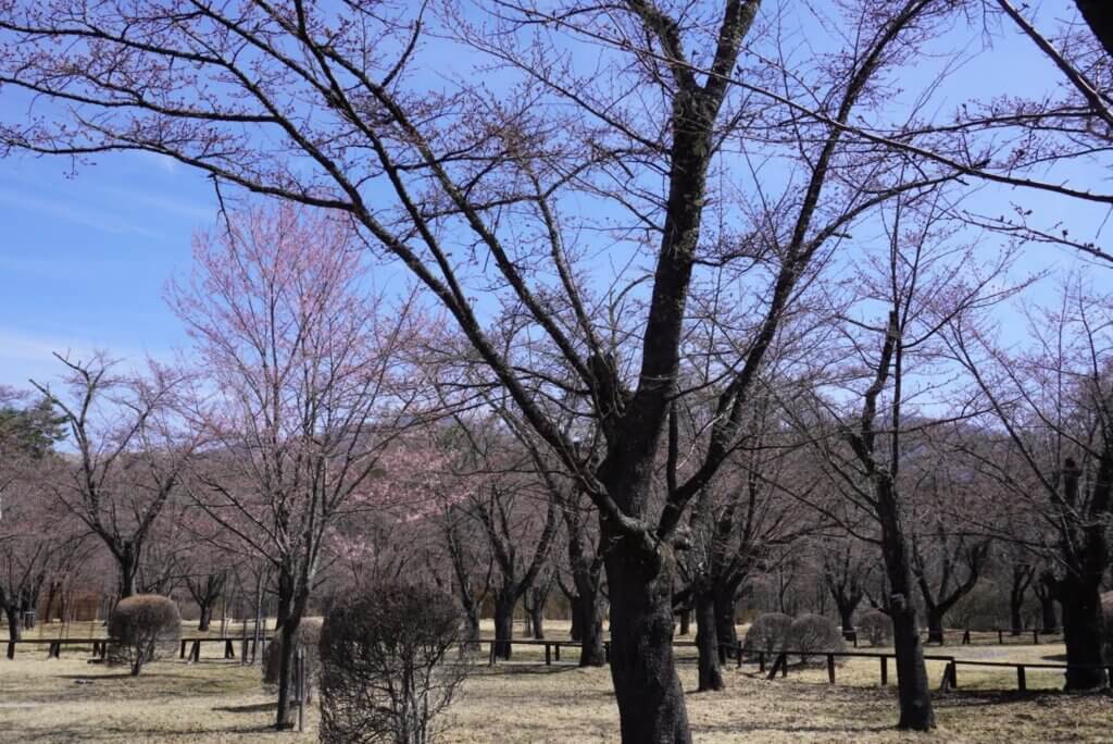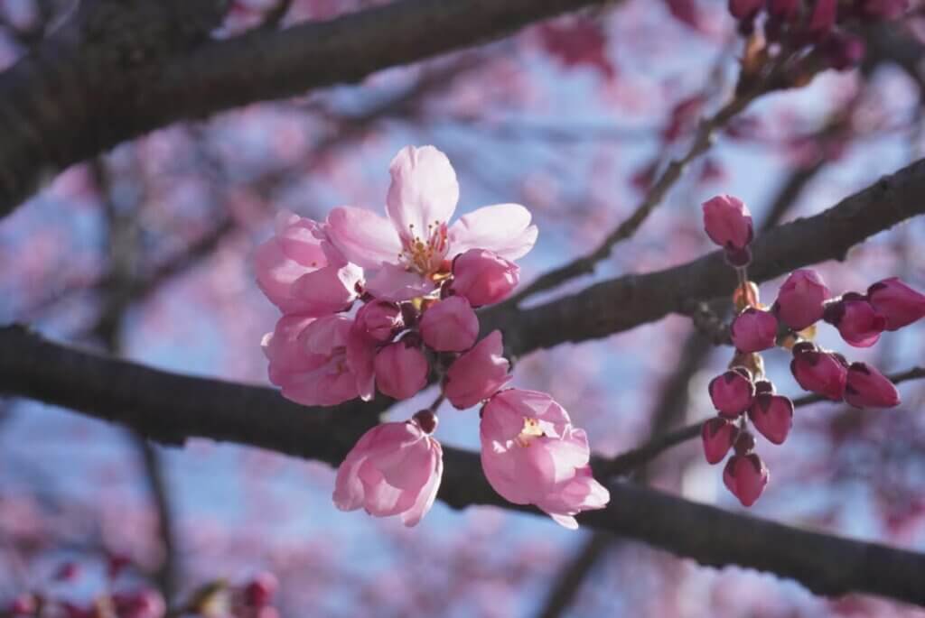 全体的にはまだツボミが多いものの、ピンク色にほんのりと色づき始めた木もあります。