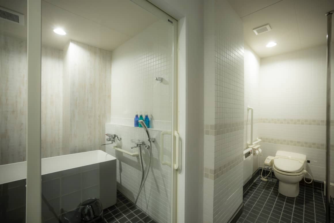 当館には車いすの貸し出しがございます。2018年4月にリニューアルした2つのお部屋は車いすのままで玄関からお部屋、トイレ、お風呂場まで入って頂けます。トイレやお風呂場には手すりも設置されており、介護施設の様にはまいりませんが、つかまって立ったり座ったりできる仕様になっております。